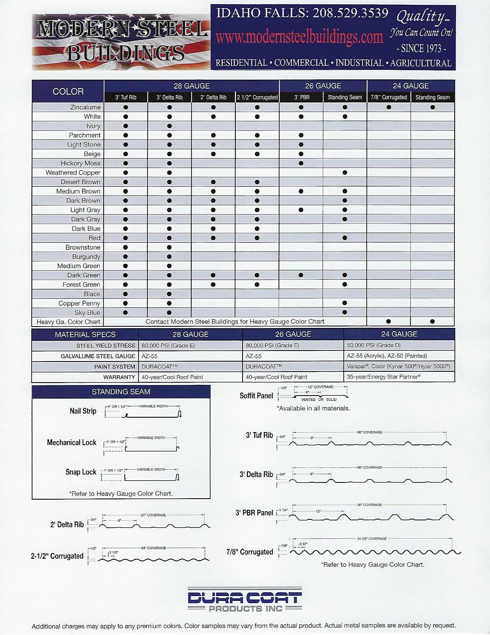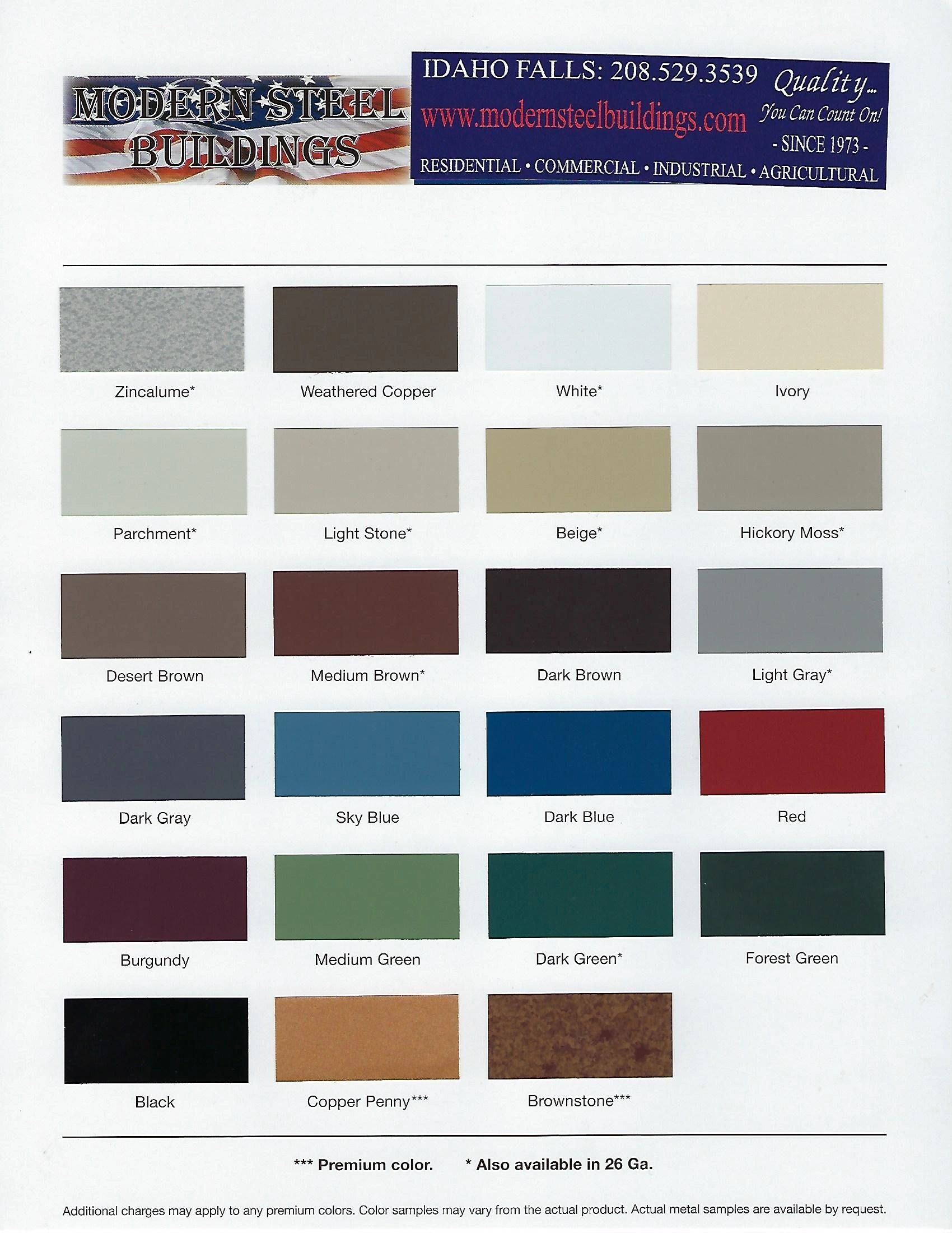 Not every thickness has all of the colors. This chart gives a comparison. Contact Modern Steel Buildings for Heavy Guage Color Chart.